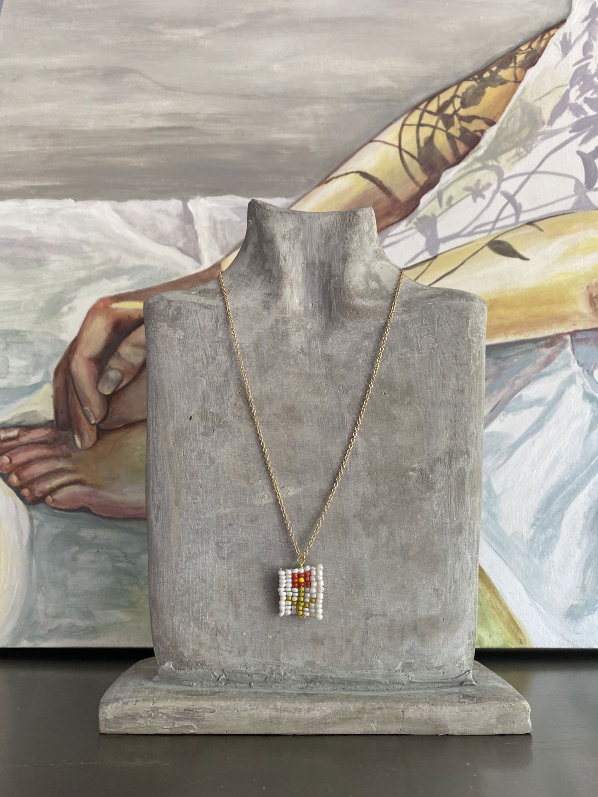 Collar con dije rectangular tejido en mostacillas, con forma de flor y patrón geométrico en tonos blanco, amarillo y rojo. Cadena fina dorada.